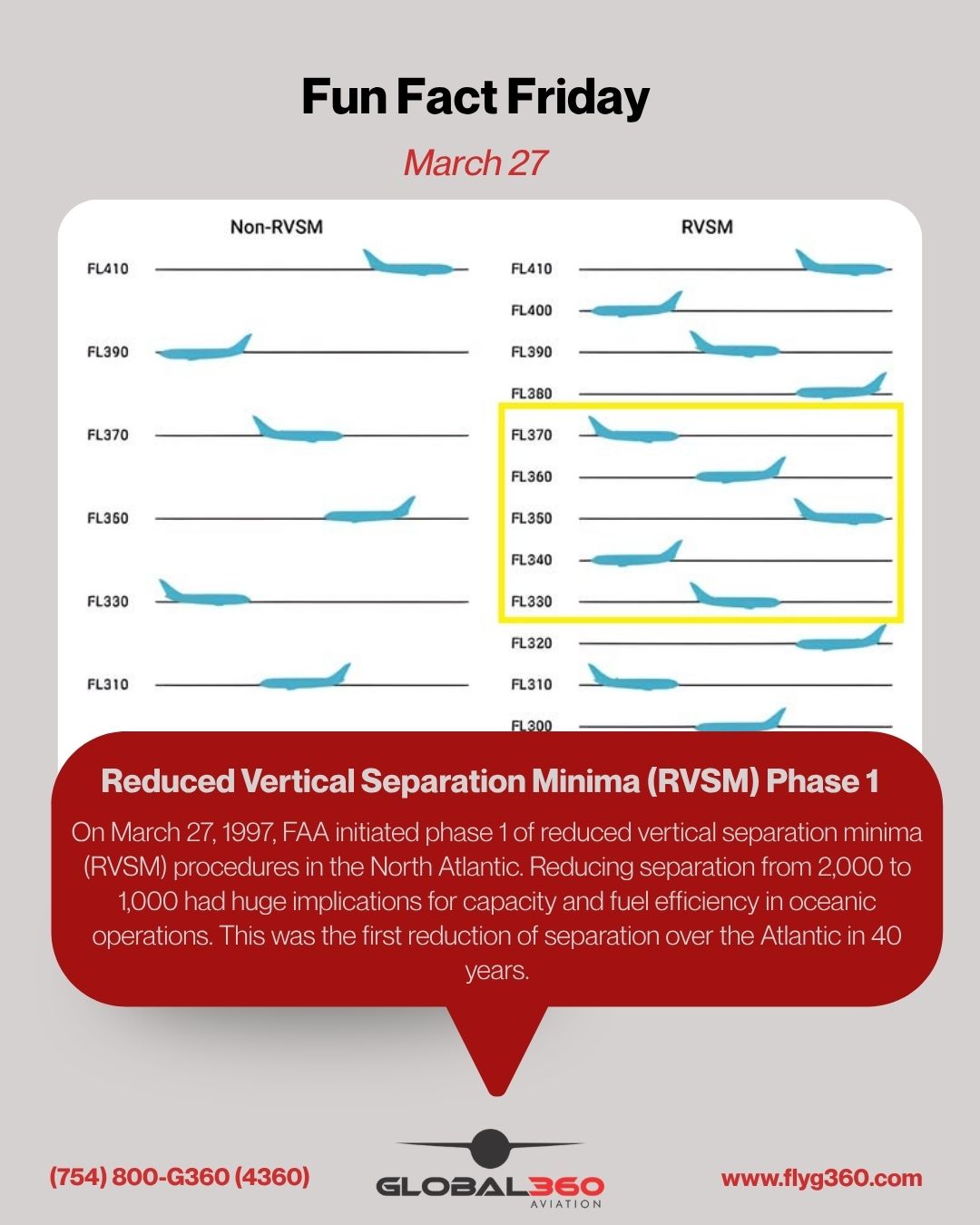 RVSM is an aviation standard that reduces the required vertical separation between aircraft from 2,000 feet to 1,000 feet between flight levels FL290–FL410. This effectively doubled the number of usable cruising altitudes, improving airspace capacity and fuel efficiency.