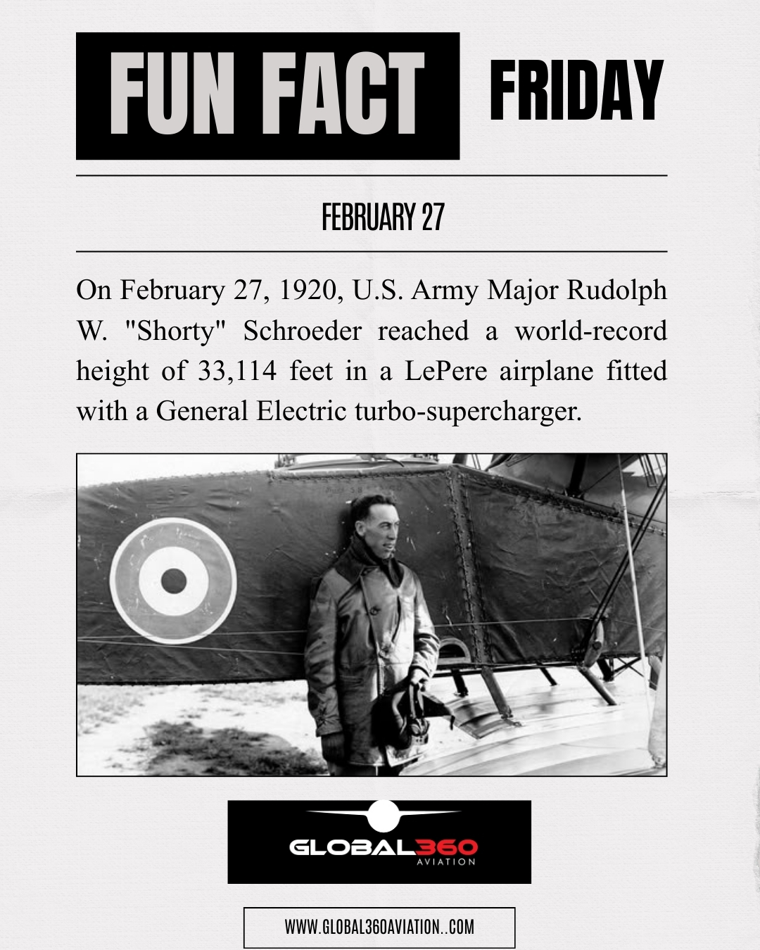 On February 27, 1920,U.S. Major Rudolph W. “Shorty” Schroeder reached a world-record height of 33,114 feet in a LePere airplane fitted with a General Electric turbo-supercharger.
